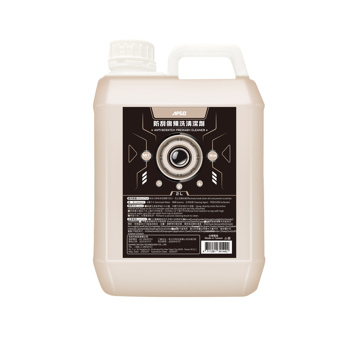 APGO 防刮傷預洗清潔劑2L 採用溫和清潔助劑與去離子水基底,專為車體預洗開路設計,能有效軟化表面泥砂、油膜與灰塵,在不觸碰車體的狀態下就能先行清除粗顆粒汙染源,進而降低後續刷洗時造成的刮痕風險,是高階洗車或鍍膜前打底的必備工序。